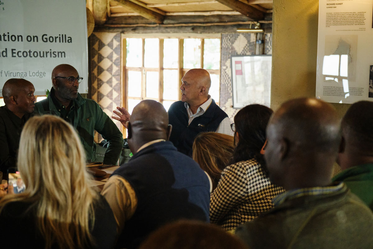 Praveen Moman, Founder Volcanoes Safaris, hosted an informal panel conversation on gorilla conservation and ecotourism with Prosper Uwingeli the Chief Park Warden of Volcanoes National Park and key partners. Felix Ndagijimana, Country Director of